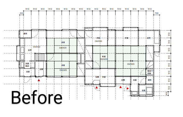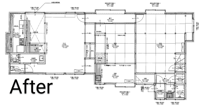 もともと複数の水廻りや玄関があり、複数世帯が暮らせる間取りとなっていた古民家を宿泊施設として快適に利用できるようリノベーション計画がスタートしました。 古民家ならではの味わいを大切にしつつ、再利用できるものは残し、既存のものをマイナスしながら新たな価値をプラスしていくリノベーションを是非ご覧ください。