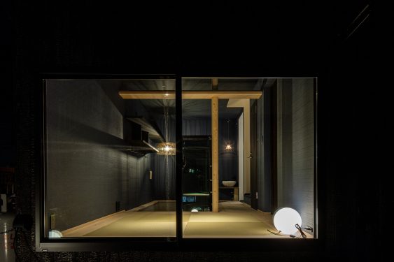 日が暮れてからの「眺望の間」。間接照明がシンプルで洗練された雰囲気を演出しています。