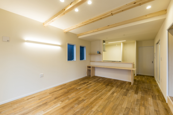 お子様が走り回ることができる、広々としたリビング。 床は無垢材を使用しています。