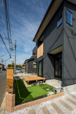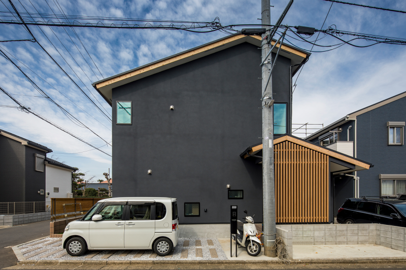 木材調のアルミ格子が玄関のアクセントになっています。 黒の左官に木材の色が美しく映えます。