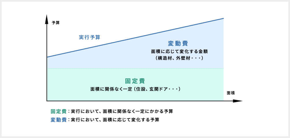 いわゆる建物の費用を坪で割った“坪単価”は建物の面積が小さくなると固定費の坪あたりの費用負担がおおきくなるので、必然的に坪単価は高くなります。 逆に建物の面積が大きくなると坪単価は安くなります。弊社では“坪単価”は厳密にはあてにならない指標と考えています。もし、あなたが本体価格”坪単価〇〇万円”に出会ったら『どのくらいの面積に対していくらなのか?』を検証しないと誤った本体価格を想定してしまいます。