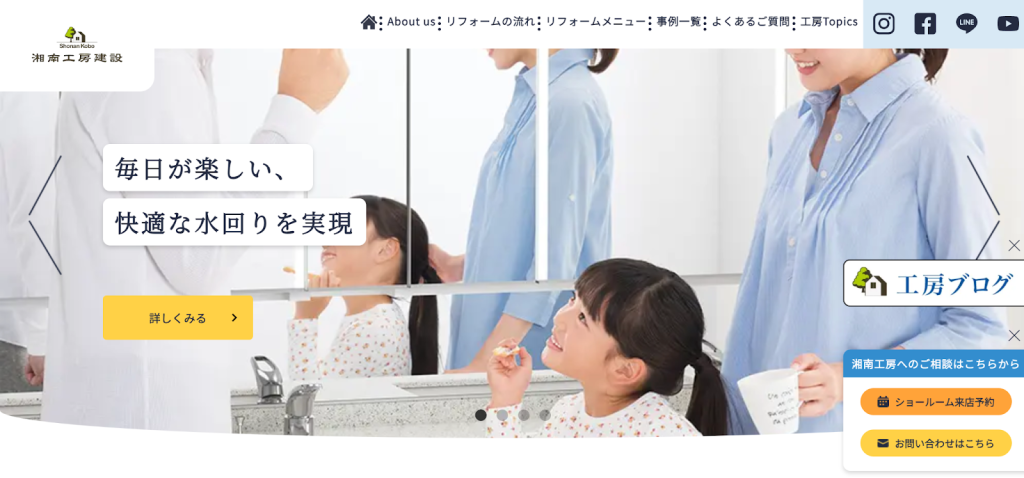 湘南工房建設は、水回りや外装リフォームに対応している会社です。藤沢市で創業して20年、自社職人・自社専属の職人で工事を実施しているため、低コストでのリフォームが可能です。地元に密着した丁寧な対応も評判がよく、問い合わせや見積りも安心して行えます。