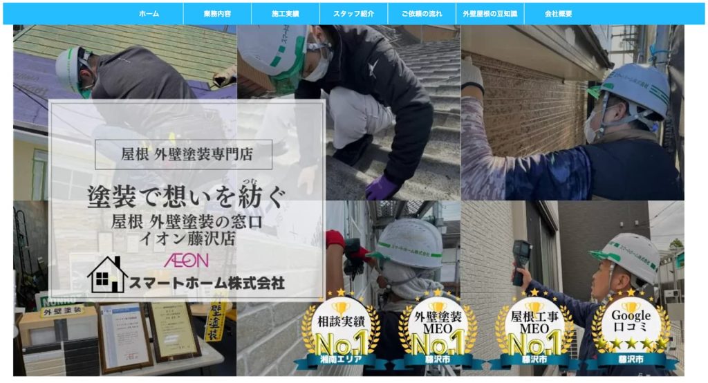 スマートホーム株式会社 住所:神奈川県藤沢市大庭5137-6 公式サイト: 藤沢、茅ケ崎の外壁塗装、屋根リフォーム、雨樋修理、雨漏り補修は屋根外壁塗装の窓口イオン藤沢店(スマートホーム)へ! (smarthome-kanagawa.com) |