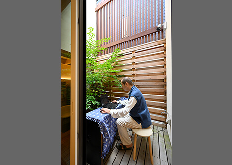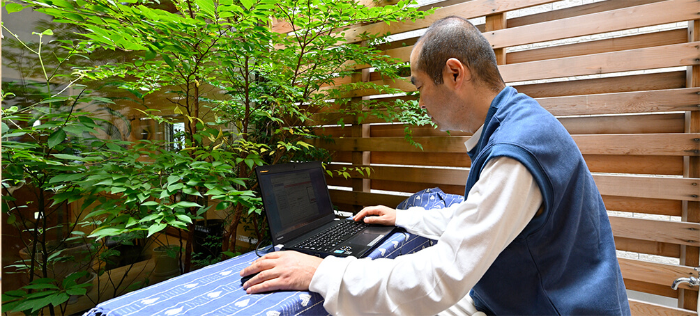 ダイニングに隣接した中庭はH様邸のキーポイント。狭小地であっても光と風を室内に取り込み、明るく快適な空間をつくり出してくれます。目隠しになるルーバーやウッドデッキを採用し、人目を気にせずくつろげるアウトドアリビングに仕上げました。植栽はヒメシャラ。天気の良い日はご主人の仕事場にもなります。