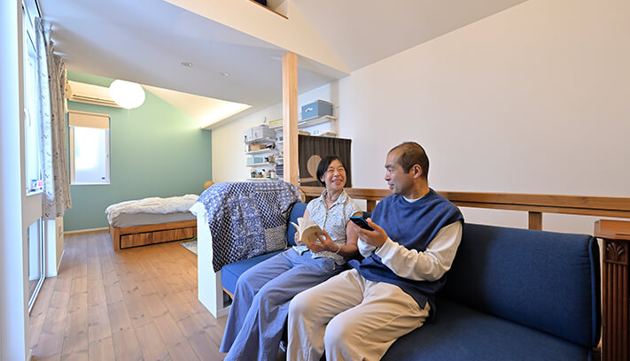 新居で暮らし始めて約1年半。「以前の家は暑かったのですが、この家は湿気がなくて過ごしやすいですね」と、住宅性能の高さや換気システムの効果を実感されているようです。H様邸の大きな特徴でもある壁のない空間は、「誰のための場所」、「何をするための場所」といった間取りの既成概念を取り払い、ご夫妻の日々の暮らし方に変化をもたらしました。「例えば、いまこのコーナーが空いているから自分が仕事に使おう、このスペースは誰も使っていないからヨガをしよう、といったフリーアドレス的な使い方ですね」とご主人。