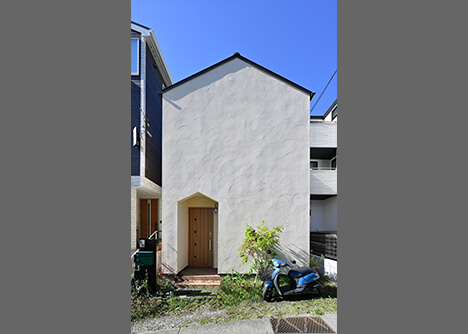 プライバシーを守るため、ファサードにはあえて窓を付けず、採光と通風は中庭で確保するのが石原スタイル。奥様好みのキュートな三角屋根に合わせて玄関ポーチも相似形にし、統一感を演出しました。外壁の淡いベージュやコテムラ仕上げが素朴な温もりと可愛らしさを感じさせる外観です。