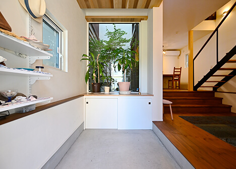 玄関ドアを開けると、まず目に入るのが中庭に面した大きなFIX窓。明るく開放的で、植栽の鮮やかな緑が家族やゲストをやさしく迎え入れてくれる玄関ホールになりました。広くゆったりとした上がり框は人が大勢来た時の動線もスムーズ。シューズボックスは窓際の造作カウンター内に設け、オープン棚を上手に使った見える収納で見た目もオシャレに仕上げました。