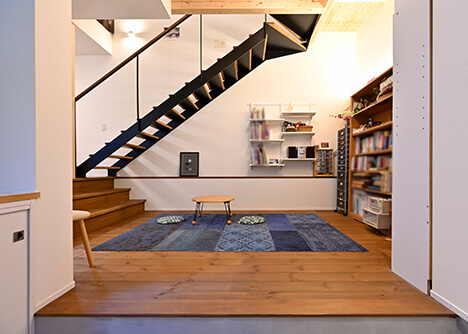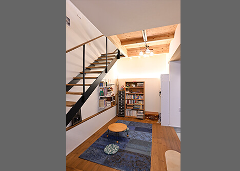 アイアンと天然木のスタイリッシュな階段は、老後の暮らしも考えて緩やかな勾配に。リビングの床を飾るのは珍しいブルーのアンティークキリム。無垢材のやさしい質感や落ち着いた色合いともマッチし、温かみのある空間に仕上がっています。