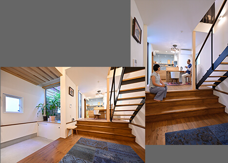 高低差のある敷地形状を活かしたスキップフロア。段差を付けることで、リビングとダイニングを仕切りながらも一体感や開放感を損なわないつくりになっています。狭さを感じさせず、暮らしにリズム感が生まれる効果もあります。ステップにちょっと腰掛けて携帯電話をいじったり、ゲストが多い時はひな壇のように座ってもらったりと上手に活用。計画当初とは違う使い途を発見するのも楽しいそうです。