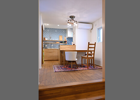 無垢材をふんだんに用いたDKはシンプル&ナチュラルな空間。キッチン3.8畳、ダイニング5.7畳とご夫婦二人の暮らしには必要十分な広さが確保され、奥にはパントリーも設置。キッチンの水色タイルは、デザイン性とお掃除の手間も意識した奥様のセレクト。ダイニング側のカウンターは手持ちの家具を無垢材で囲うように造作したもの。統一感を演出すると同時にとムダな出費も抑えました。「機能的に設計されているので、お料理しやすくなりました」。