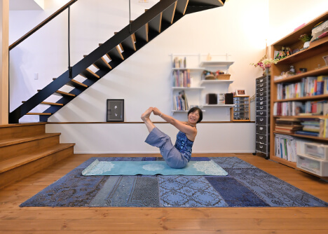 リビングはヨガインストラクターとして活躍されている奥様のトレーニングスペースとしても活躍。ゆくゆくはプライベートレッスンにも使いたいとお考えで、玄関との距離感やナチュラルな雰囲気もピッタリ。明るい光と自然素材に囲まれて心が落ち着き、レッスンに集中できそうです。