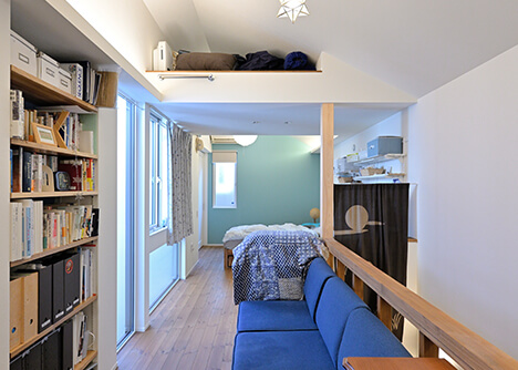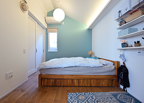 勾配天井で伸びやかさを演出した2階寝室は4.5畳。壁のないワンフロアだから実際の面積以上に広く感じます。左奥は家事室。シンプルながら壁やラグのブルーが差し色となり、オシャレな空間に仕上がりました。