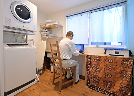 2階に水まわりがあるため、洗濯から乾燥、アイロンがけなどの作業が1カ所で完結できる家事室も2階に設置。ベランダはありませんが、布団などの大きな物はここに干せるよう工夫されています。「ここで在宅ワークもできるので、いい気分転換になります」とご主人。