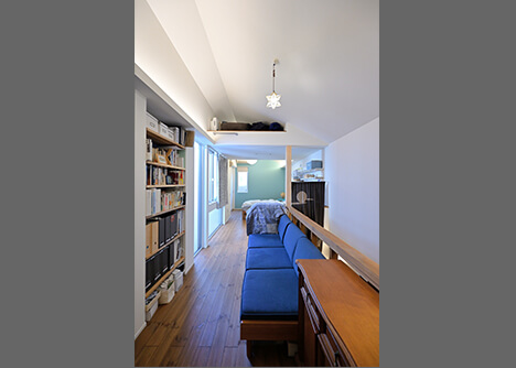 階段を上がってすぐのエリアはセカンドリビング。手持ちのソファを置くのに丁度いいサイズ感や書棚の位置も使い勝手よく計算され、コンパクトながらご夫妻がゆったりとくつろげるプライベート空間になっています。