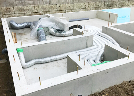 頑丈なベタ基礎を採用。床下には換気と排気を機械で計画的に制御するシステムの配管が巡らされています。